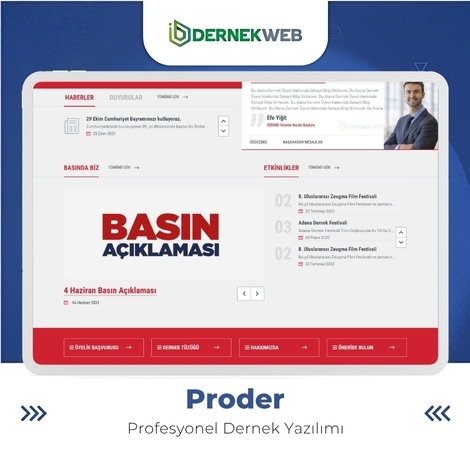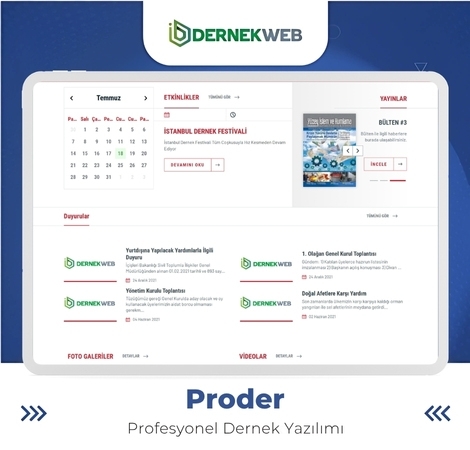 Derneğinizin dijital potansiyelini ortaya çıkarmak ve tüm yönetim süreçlerinizi tek bir platformda birleştirmek için tasarlanmış yeni nesil çözümle tanışın: Proder Derneklere özel olarak geliştirilen Proder, profesyonel bir dernek sitesi altyapısını güçlü yönetim araçlarıyla birleştiren en kapsamlı hazır dernek sitesi platformudur.